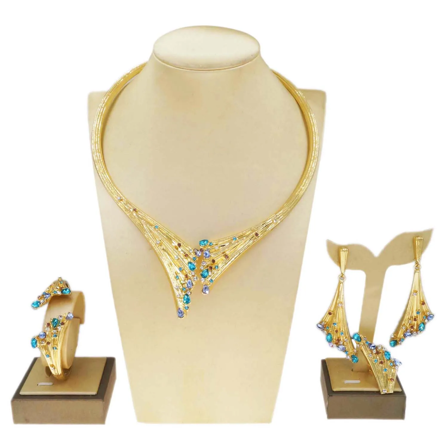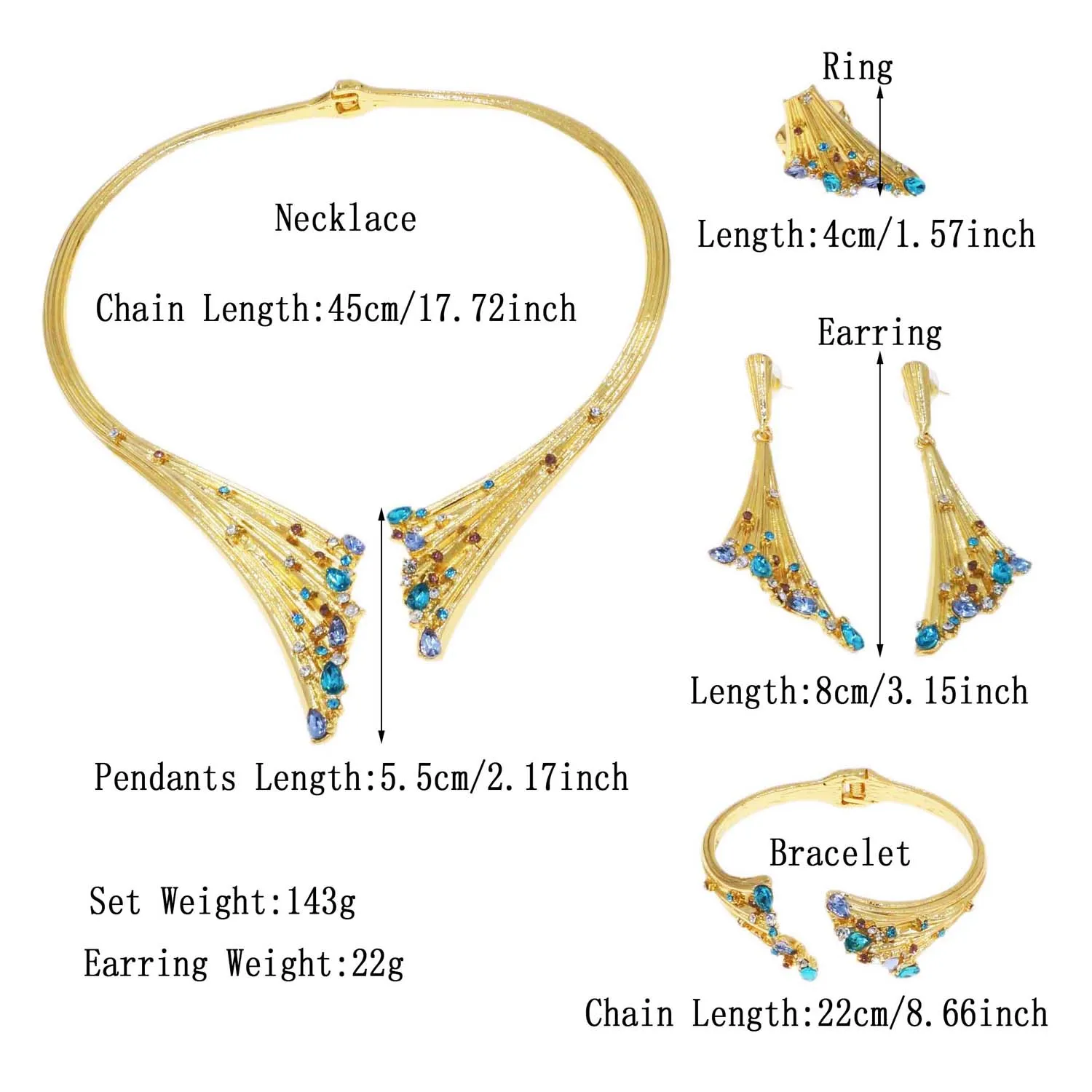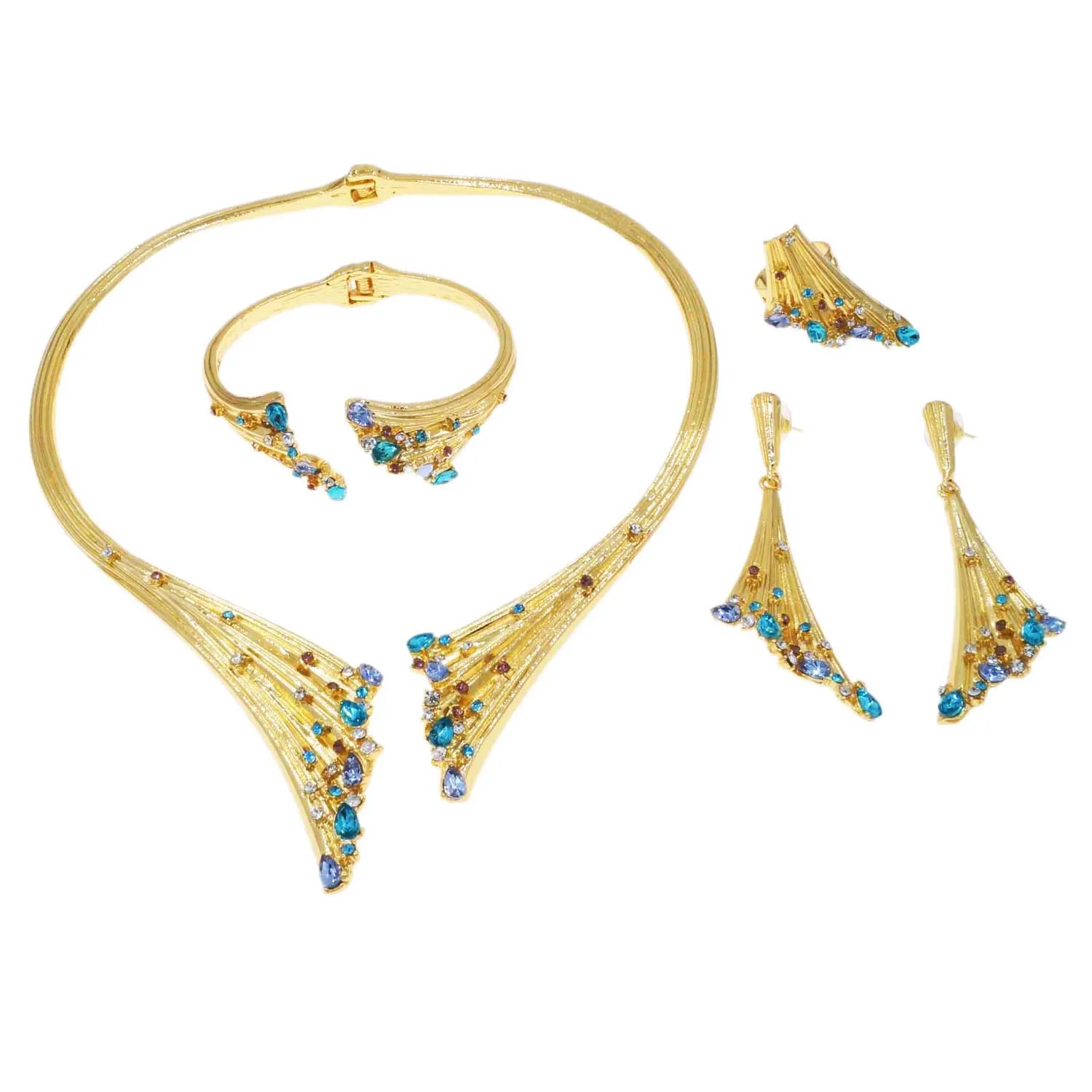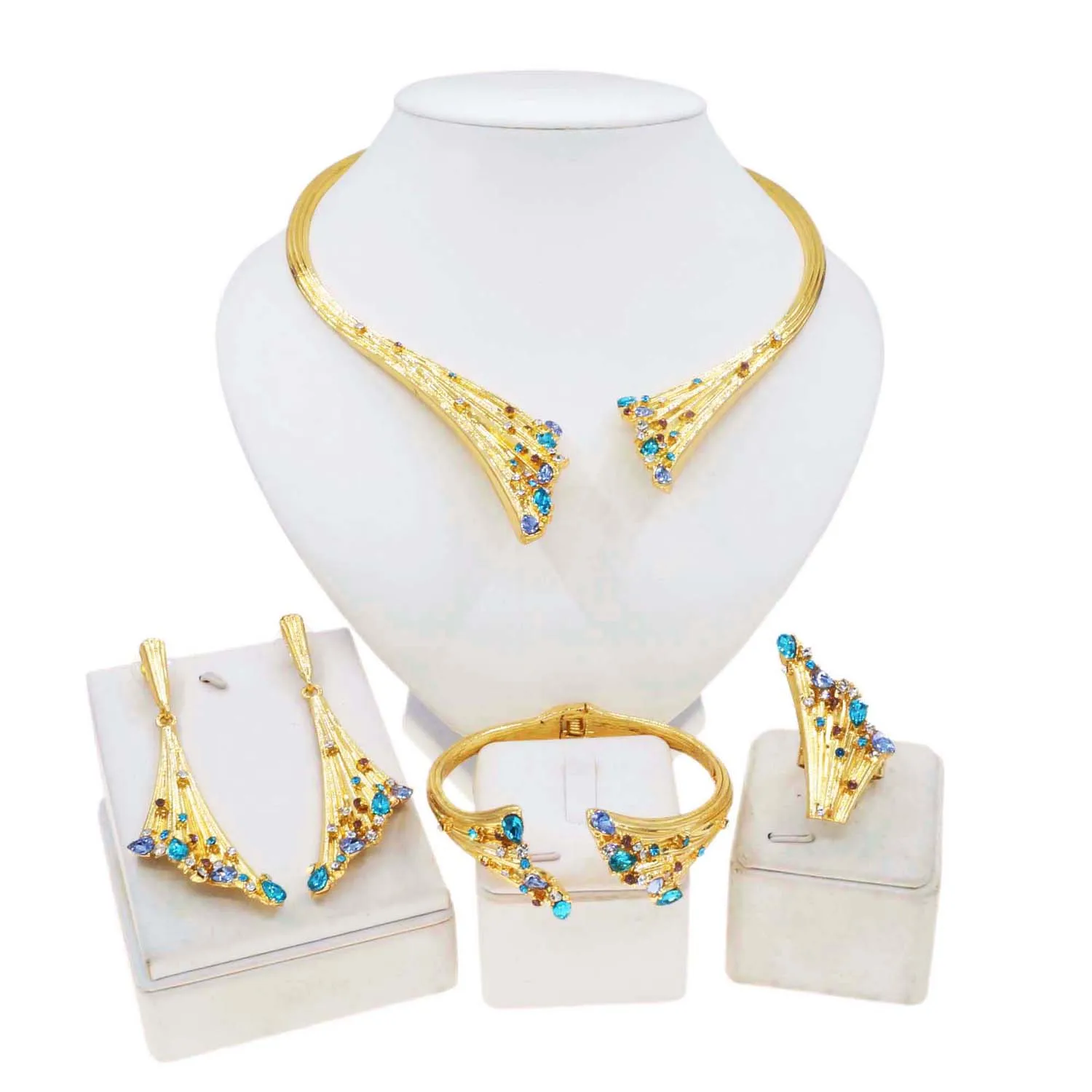 Dubai Gold Plated Woman Jewelry Set Women's Luxury Blue Stone Necklace Bracelet Ring Set Jewelry Sets Wedding Party Jewe