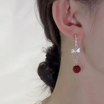 Elegant Red Zircon Butterfly Drop Earrings for Women Temperament Sweet Metal Bow Earrings Fashion Girl Jewelry Accessories